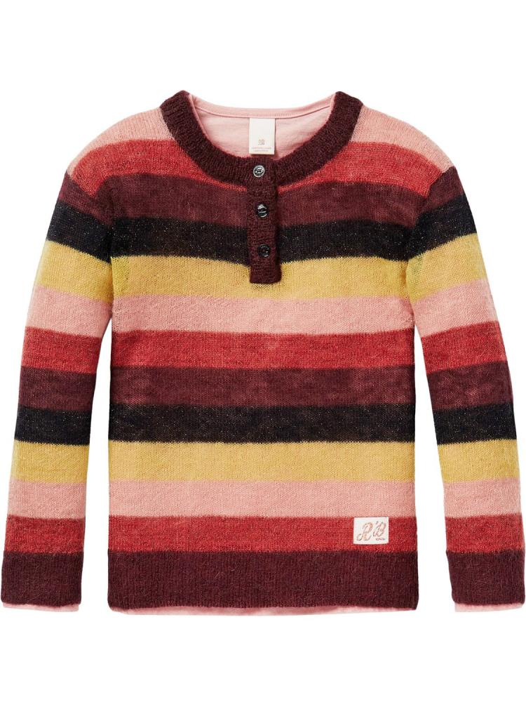 Dieser Pullover aus einer Wolle-Mohair-Mischung besticht durch sein 2-in-1 Design, bestehend aus einem Streifenpullover und einem innenliegenden langärmligen rosa Shirt. Der Pullover ist aus einem flauschigem weichem nicht so dickem Strick gefertigt und hat eine Knopfleiste am Kragen. Das I-Tüpfelchen sind die dünnen eingearbeiteten Lurex-Fäden.